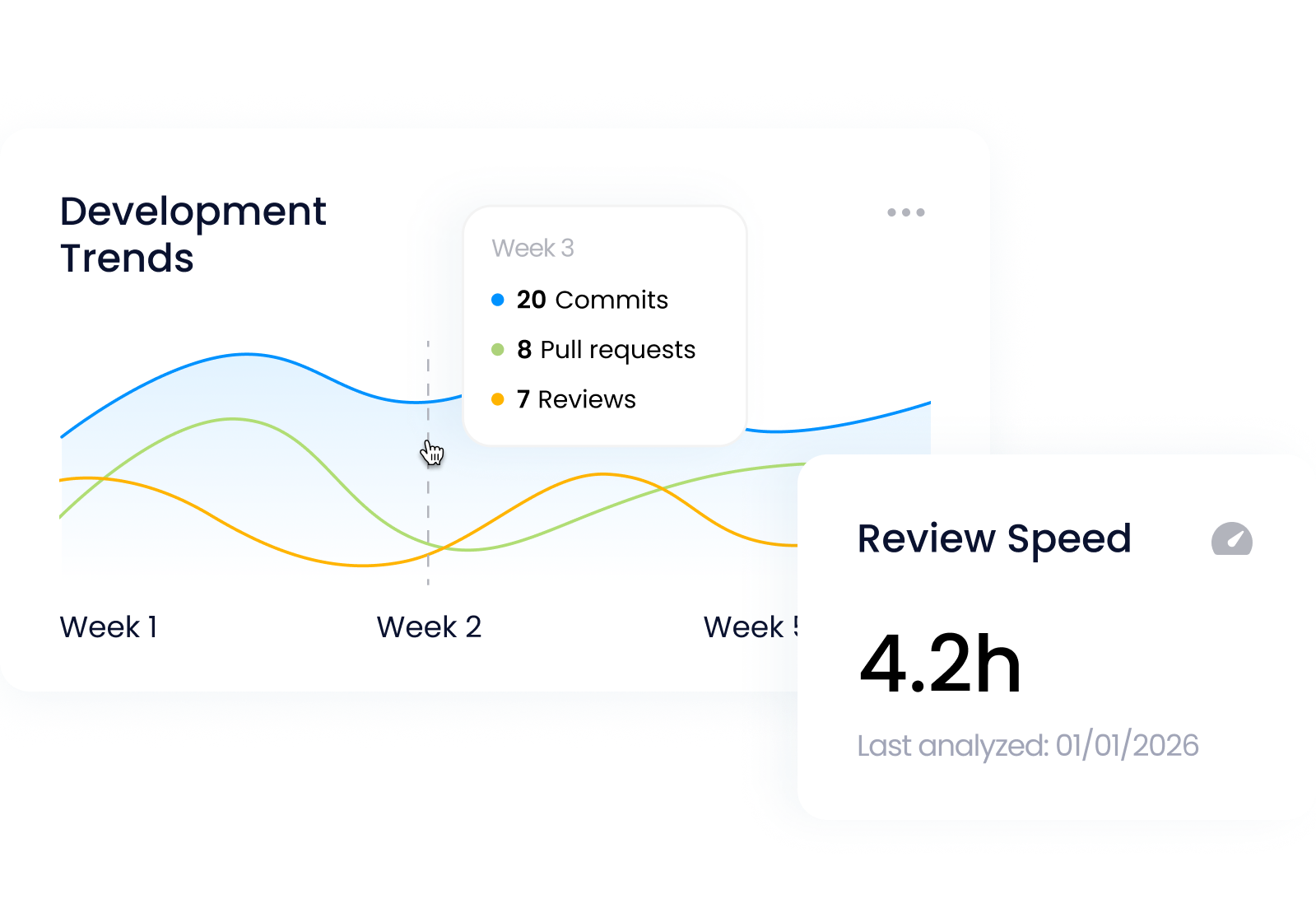 Efiros analyzes development workflow data: commits, pull requests, reviews, and repository activity — to understand how delivery actually behaves over time.